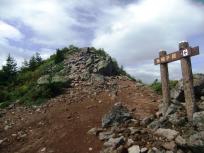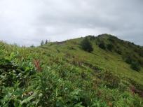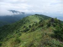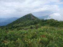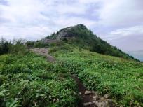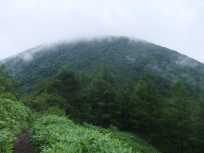 登りに入って少しして後を振り返ると湯ノ丸山が見えました。山頂には、思いっきり雲が掛かっています。あれが、ガスワンダーの正体だったのですか。ふぅ。 烏帽子岳で昼食タイムを取りたいから、このまま、天気が保ってくれるといいなぁ。 |