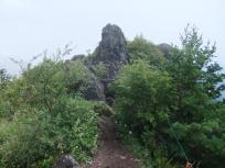 | 登山道の真ん中に大きな岩。そしてその上に重ねられたたくさんの小石。日本人は何故かこういうところに石を積みたくなります。 | ||
