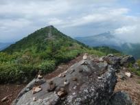 | 今度こそピークに違いない!の思いも強く、←のピークに辿り着くと、またしても先がありました!! →の岩山を越えなくてはならないようです。 |