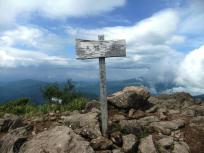 | 左手に←のパノラマを楽しみつつ、岩の間に進路を見つけて息を弾ませて進むと…とうとうありました!山頂標示が!! 烏帽子岳登頂成功!!! |