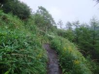 | 湯ノ丸山山頂から鞍部への下山は雨の中。道は岩・石の連続でゆっくりじっくりを心がけました。 | |||
