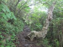 | 鞍部に着く頃には雨が上がり、鞍部は広場になっていて、ここにある枝振りのよい木の下でレインウェアを脱ぎました。 時間的には昼食タイムであり、ここでおにぎりを1個だけ頬張ってエネルギー充填。下りでエネルギーを相当費やしたので、補給しないと、烏帽子岳を登れません(笑)。 |