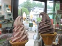 | そうしてレインウェアを来たまま地蔵峠の駐車場に到着。お疲れさまでした〜。 地蔵峠に何軒かあったお店で営業しているお店でソフトクリームタイム。ブルーベリーとこけもものソフトクリームで疲れを癒しました。 |