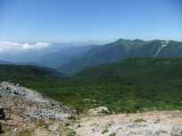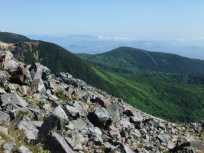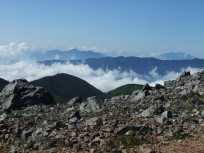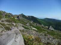 | 茶臼岳から尾根伝いの山々。おそらく一番手前が朝日岳ではないかと思っていますが、間違っていたらすみません。 足元が岩でゴロゴロしているので、基本、足元に注意を払って登っていますが、ときおり左右を見回したり、後ろを振り向いたりすると、大パノラマが広がっていました↓。 |