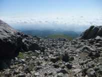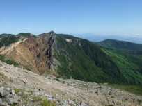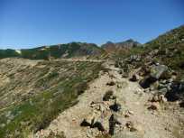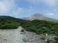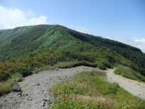 | 手前のピークを巻いて、奥のピークが南月山。 南月山に近づいたら、またまた緑が少なく、石がごろごろの場所が多くなりました。 そして、この辺りになると後を振り向いても茶臼岳が見えなくなりました。 |