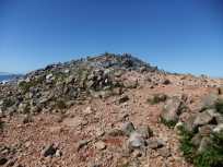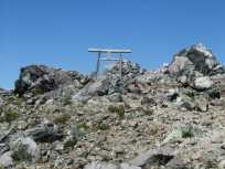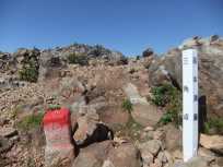 | 岩にペンキで描かれた矢印がルートなので、それを一生懸命トレースします。 岩がちの登り道も木曽駒ケ岳や湯ノ丸山で経験したから大丈夫。一つ一つ、地道にクリアしていきます。 茶臼岳は、山頂から少し手前に三角点があるので、まず、そちらを目指して歩きます。三角点がそこにあるなら、ぜひとも三角点にお目にかかりたい三角点ハンターな私。 |
