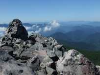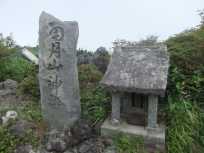 | シルエットのような山々と下から湧き上がってくるかのような白い雲。魅入ってしまいました。 ひとしきり、うっとりと眼前に広がるパノラマを眺めてから、山頂へのアタック(?)を再開します。 一際高いところにある鳥居と祠があります。 |