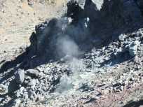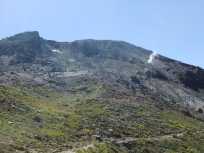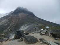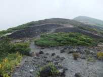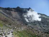 茶臼岳山頂から次のポイントの峰ノ茶屋跡避難小屋までは、茶臼岳のお釜を周遊して行きます。 お釜からは噴煙が立ち昇り、風向きに寄っては硫黄臭が鼻をつきます。 “地球は生きている”を実感。 |