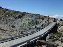 | ←休憩場所から歩いてしばらくしてから、来た道を振り返るとこんな感じ。ほぼ平坦です。 途中、噴煙が間近に上がるところでは、橋が掛けられていました。地熱…かな。 |
