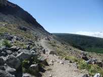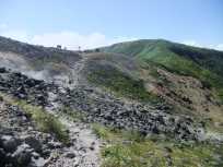 | このお釜周遊がほぼ終わりの行程で、私たちの進行方向から来たご夫婦の男性から、「茶臼岳の山頂は近くですか?」と尋ねられました。この男性は顔が熟れたように真っ赤に蒸気してらっしゃって、これまでの行程がいかに大変だったか忍ばれました。そこで、つい直登するルートに加えて、今、歩いて来たばかりのお釜周遊ルートの方が距離はあるけれど楽だと申し添えてしまいました。 少しお話しを伺うとロープウェイを使わずに、無料駐車場から登っていらしたとか。お疲れさまです。 |