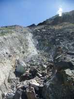 ←の道の続く先で、朝、登った登山道と合流→。そこからは、朝、登った道を下ります。石に足を不用意に乗せてグラッときそうで、登りより下りのほうが怖いです。 この辺りには、幼児連れの親子三世代のご一家が賑やかに写真を撮っていらっしゃって、THE観光地!な雰囲気でした。 |