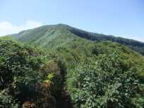 | 私たちの計画では、この牛ヶ首から南月山を往復する予定です。小学生の一団も南月山へは行かないはずですから…。 牛ヶ首から南月山への道は、それまでの岩石ごろごろな道から、普通に緑に囲まれた登山道になりました。 途中から牛ヶ首を振り返ると、案の定、小学生たちは牛ヶ首で休憩。 |