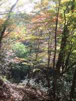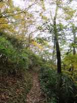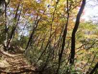 | 縦の鎖場、木製のハシゴ、横の鎖場と、難所が三つ巴になって襲いかかってきた登山道でした。山歩きを始めて1年経ったばかりの初心者にとっては、緊張感溢れるスリリングな道が、ステキな紅葉を挟んで、飴とムチのようにありました。 鎖場を抜けると、こ〜んな→穏やかな尾根道もあったりして…。 |