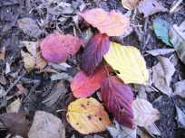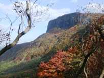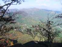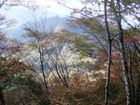| 目を上げると特異な山容の荒船山。 足元に目を転じると、そこには、黄、オレンジ、朱、エンジの落ち葉がありました。秋の山を歩いているのですね。 |