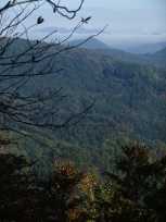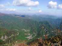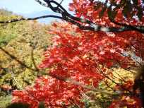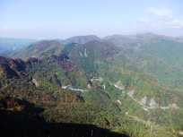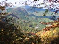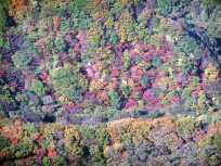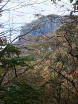 | 大きな岩で展望が広がる場所が出て来ると、艫岩まであと僅か。 お隣の山へ続く錦の紅葉。 そして、岩から十分注意して、下を覗きこむと→の紅葉が麓に広がっていました。 |