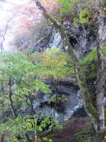 左上のような山並みを見つつ、緑と紅葉し始めた朱色が鮮やかな木を愛でつつ、艶やかに色付いた紅葉を堪能しながら歩きます。文句なしに楽しい☆ そうこうするうちに、鋏岩修験道行場跡と艫岩の間で、やや艫岩よりにある水場の一杯水に到着。 そして、ここからが踏ん張りどころでした。 |