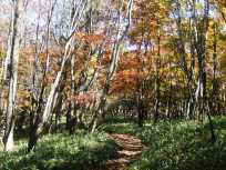 | 見事な紅葉に、この日何度目かの「いい時に来たね〜」と声も弾みます。 この平らな道を抜けると経塚山へ一気の急坂が待ち受けていました。 |