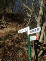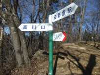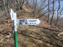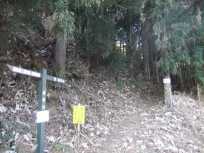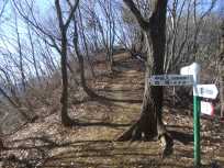 | 高川山直下で、8人くらいの熟年女性グループとすれ違い、 「山頂まであとどれくらい?」、「どこから登って来たの?」と尋ねられたので、 「あと少しです」、「田野倉駅からです」と答えました。田野倉駅と聞いて、「ピストンなんだ〜」と言われてしまいましたが、説明が長くなるので、ここは反論せずにそういうことにしておきました。 壬生分岐まで来たら、道標に従い→の写真の向かって右の中谷入コースの登山道を進みます。 |