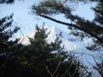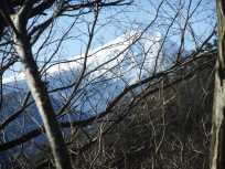 | そうしたら、進行方向左側の木の間に富士山の姿が見え出しました。 ここで一気にテンションが高くなります。2013年初登山の高川山は、富士山が見える山が選択理由で、何だかそれが叶うかも…な予感。う、嬉しい♪ |