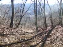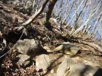 | ←おそらく、この道標があった辺りに馬頭観音があるはずなのですけれど、見事に見落としてしまいました。あっれ〜? ここで尾根道に出たようです。 田野倉駅を出発して1時間以上が経っているので、ここで休憩、おやつタイムです。見通しのよい尾根道でのおやつタイム、気持ちいい♪ |