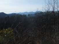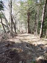 | 薬師堂に向かって左手に進んで、程なくすると登山道になります。今回は、行きは薬師堂コースをとります。 落ち葉を踏みしめながらの陽だまりハイキング。葉の落ちた木立ちの隙間から、秩父の山々が望めます。 |