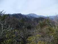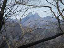 | そして、登ることしばし、尾根道に出ました。尾根道は多少のアップダウンがありつつの、基本的に登り基調です。 樹林のピークを過ぎて尾根道を歩いていると、右手に…猫の耳のような山を枝の隙間に発見! |