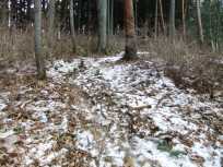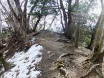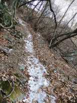 | そうこうするうちに、登山道上に残雪が出てきました。この残雪、カチンコチンに固まって、もう“雪”というより“アイスバーン”。ひたすら、滑って転ばないように気を付けて、できるだけ雪を踏まないようにして歩きました。 ここはまだ数10mで残雪がなくなり、普通の落ち葉の道に戻ったからよかったのですが…。 |