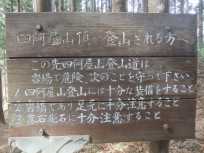 出発してすぐに、←の注意書き。 「四阿屋山頂へ登山される方へ この先四阿屋山登山道は岩場で危険、次のことを守ってください。 1.四阿屋山登山には十分な装備をすること 2.岩場があり足元に十分注意すること 3.落石飛石に十分注意すること |