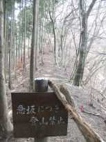 | それでも出だしの何分かは、まだまだ杉木立ちの普通の山道。 それが、→の「急坂につき登山禁止」の看板で、直登の登山道ではなく、迂回の登山路を進むころから、岩場と岩の上や隙間でアイスバーンになった残雪に四苦八苦しながら登ることになります。 |