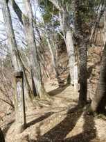 | 何とか、つつじ新道との合流地点に到着。このつつじ新道も初級者には難易度の高い登山道のように、→の立て看板には書いてありました。 福寿草の見頃が残雪時期なので、その時期に山頂を目指すのは…。 |