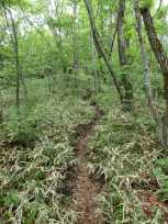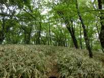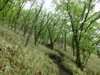 | 縦のロープ場→を登り、穏やかな笹の繁る道↓を過ぎると烏帽子ヶ岳の山頂に到着です。 | ||