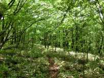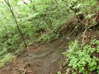 | 鞍部近くに←の標示が。後半急坂…ですか。標示に書いて注意を促すくらいの急坂ってどんな急坂…少し不安。 でも、最初は木洩れ陽の道。 |