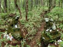 | 2つ目の鳥居の奥には、狛犬ならぬ狛狐さんが鳥居と登山道を守っています。 狛狐さんに見送られ、しばらく歩いて鞍部に到着。鞍部を登って来た道を背に右へ進むと烏帽子ヶ岳、左に進むと鬢櫛山です。まずは、右の烏帽子ヶ岳に向かいます。 |