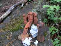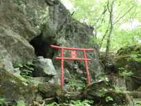 | 鞍部を過ぎると烏帽子ヶ岳への道は急坂な箇所があります。 急な岩場を登ると3つ目の鳥居。その近くの岩の上には、素焼きの狐さんが奉納(?)されています。このお山はお狐さまがお守りになっているということでしょうか。 |