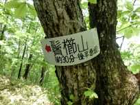 | 徐々に勾配が急になっていくような気が…。 鞍部から約30分で鬢櫛山山頂に到着。 鬢櫛山山頂。最初、→の山頂標示に気づかなくて通り過ぎてしまいました(苦笑)。何か変…と引き返して、ようやく山頂標示を発見。う〜む〜。 |