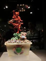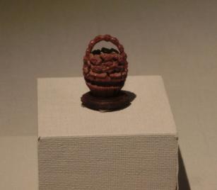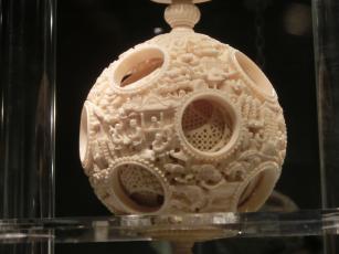「雕象牙透花雲龍紋套球」は象牙の内部が24層に分かれているのに対し、こちらの「雕象牙透花人物套球」は17層に分かれて彫られているそうです。いずれにしても、精緻な匠の技の一品。グルグル周囲を見て回って見学しました。