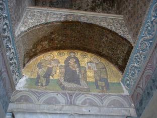 アヤソフィアの見学を終え、出口に向うとき、振り返って見上げれば、そこに「聖母子にアヤソフィアを献上するモザイク」がある。