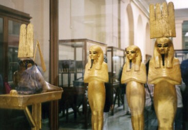 エジプトが誇る宝物の数々が展示されているエジプト考古学博物館。 それはそのまま人類の宝物と言っても過言ではない。 その中でも人気なのがツタンカーメンの部屋。黄金のマスク、玉座、寝台、黄金の棺、黄金の厨子など、王家の谷で発見された御物が所狭しと展示されており、時の経つのも忘れて見入ってしまう。 今回の旅行(2003年1月時点)では、カメラはフラッシュ禁止。つまりフラッシュをたかなければ撮影OK、ビデオ撮影可だった。ありがたい。 |