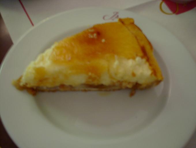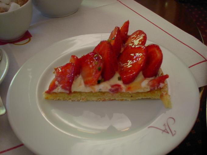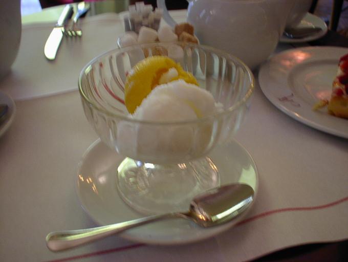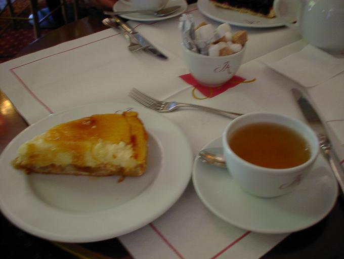 | ケーキセット8.5ユーロは、何種類かのケーキの中から1つ又は何種類かのシャーベットの中から2種類をチョイスできる。ケーキは“百聞は一見にしかず”主義らしく、ケーキの置いてある場所で好きなのを指差しで選ばせてもらえる。シャーベットはメニューから英語での説明を聞いて選ぶ。観光客相手なので、日本人にも実に判りやすい英語。 サロン・ド・テなので、お茶のオーダーも“テ”(紅茶)ではなく、ダージリンとかオレンジ・ペコとか茶葉のメニューからチョイスする。オリジナルブレンドを選んでみた。紅茶はポットサービスでカップに2杯とちょっと。ケーキがそれなりに甘いのでたっぷりの紅茶が嬉しい。 |