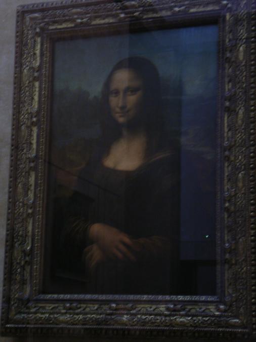| とりあえず、またしても『モナ・リザ』にご挨拶してから、フランス絵画の部屋を目指すことにした。 本日は繁忙日なルーヴルだけあり、『モナ・リザ』の前は黒山の人だかり。夜間開館時は予想より人が多かったとはいえ、やはり日中よりは人が少なかったことを実感する。 『モナ・リザ』はこの春にできたてホヤホヤのコーナーで防犯(?)ガラスに守られて我々に微笑みを向けている。お向いさんは『カナの婚礼』。『モナ・リザ』のある部屋は、順路が絵入りで指し示されている上に、入り口に絵入りの垂れ幕が下げられているので、個人で行っても迷うことはないはず。 この防犯ガラスが曲者で、写真が…。(:_;) 「じっと見入ってないで、他の人と交代してくださ〜い」状態だったので、実際に最前列でご対面していたのは2分〜3分あったかなかったかではないだろうか。 |