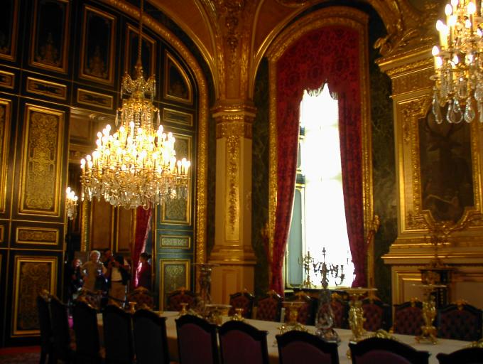 『王妃マリー・ド・メディシスの生涯』の部屋の見学を終えてもまだ集合時間まで少々時間がある。ラッキー☆ 計画を立てていた段階では、時間がなくて無理かと思っていた『ナポレオン3世の居室』へ行くことにした。ここは、絵画部門を先に回ると位置的に最も遠いところにあるので、時間的に余裕があるときか、行くゾ!と固い決意の元でないと見学に訪れにくいかもしれない。 今回、初めて行ったら、宮殿の内部はかくありなんと思えるゴージャスさで思いのほか良かった。 |