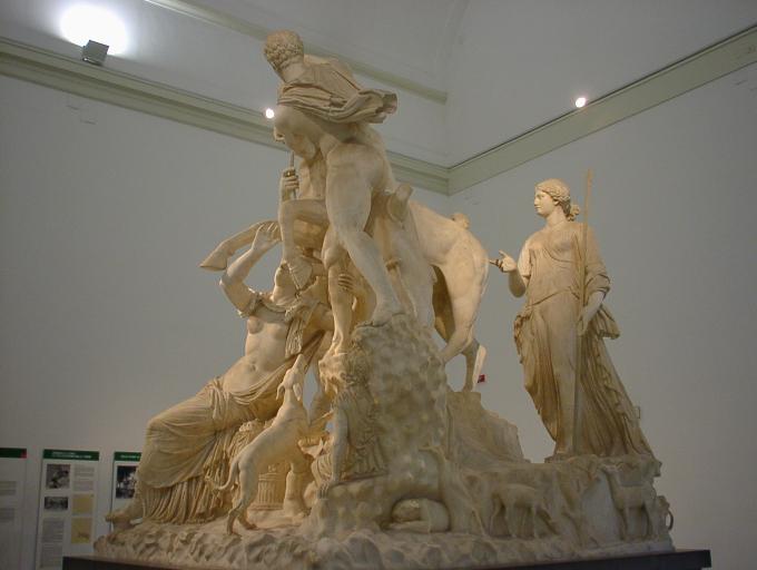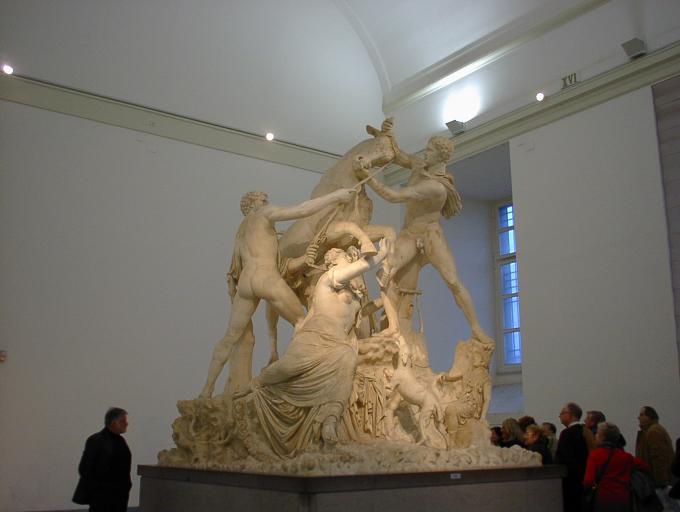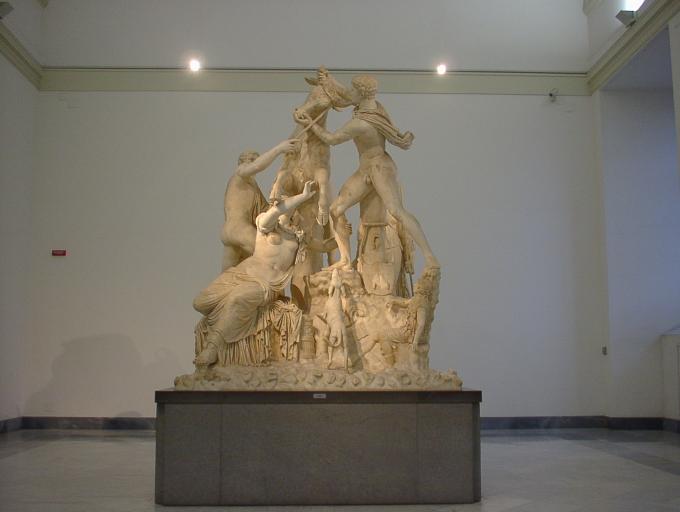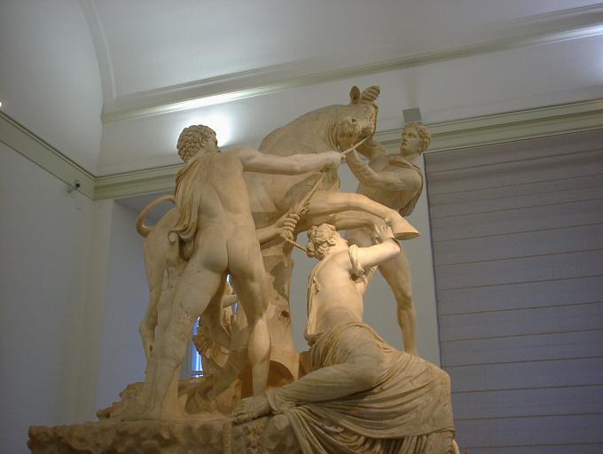 | ファルネーゼの牡牛 正面 ダンナの美人の恋人さん(左手前の女性)に嫉妬した正妻さん(奥で見えない)が恋人さんに牡牛をけしかけたら、恋人さんに想いを寄せる男性たちが助けに入るの図、 だそうだ(笑) ローマのカラカラ浴場からの出土品 |