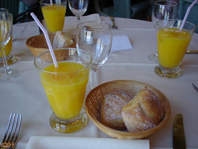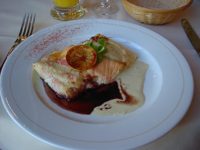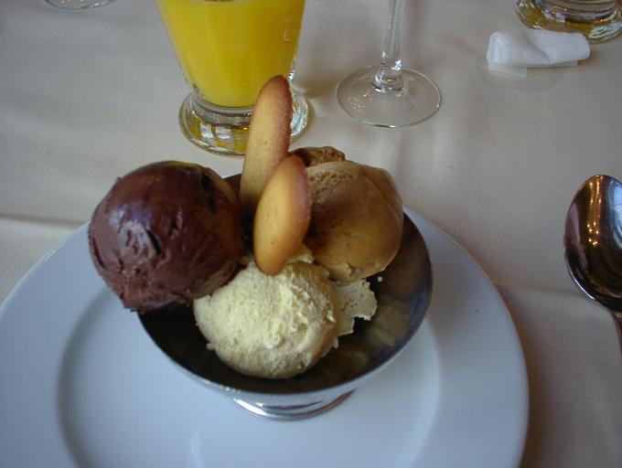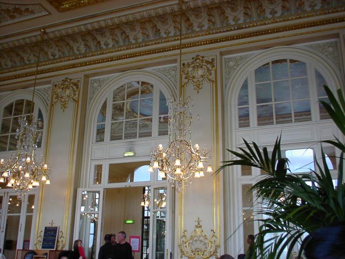 入場したら11時30分頃だったので、食事をしてからの見学に予定変更し、2階のレストランへ。2階のレストランは11時45分からの営業だったので、並んで待つことしばし。←のような豪華なレストランで2005年フランス最後の食事となった。 ランチセットと飲み物をオーダー。ランチセットはメインの魚料理とデザートの2コースメニュー。デザートはケーキとアイスから選択可。 ジャックマール・アンドレ美術館でケーキを食べたので、オルセーではアイスにした。 オレンジジュースはフレッシュで、氷も浮かんでいて幸せだった。(*^^*) 2005年フランス旅行で最も豪華でおいしいお食事はしめて17.5ユーロ。料理は美味しいし、レストランの内装は豪華で雰囲気はいいし、最高のお食事。 アイスは3種類じゃなくて、1〜2種類でいいので、その分、カフェ・オ・レにしてくれたらよいのに…。(願望) |