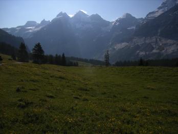期待通りのワクワクなハイキングコースに、山々や花を見て楽しんで歩いていると、何故かいつのまにかツアーの最後尾にいる自分に気づく。どうしたの皆さん。どうしてそんなに一心不乱に歩かれて行くの?ツアーのパンフレットが“エッシネン湖散策”で、とくにエッシネン湖までの行程をハイキングとうたってないから、エッシネン湖しか頭にないのかしらん。(でも某ガイドブックやスイスのハイキングツアーには、エッシネン湖往復もハイキングコースにしっかり入ってたし〜。)もうちょっとゆっくり歩きましょうよぉ。
