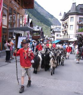 バーンホフ通りを散策していると駅方向から3人のペーターたちに率いられたヤギたちの行列が近づいて来ます。ツェルマットの観光行事として行われているものらしく、ヤギさんたちは毛並みはペカペカで、一糸乱れず汚れ一つありませんでした。観光地化されている表れですが、観光客としては単純に嬉しい1シーンです。