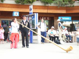 ツェルマットの駅前ではヨーデルのアトラクションも行われていました。私たちが駅まで行ったときには、もうヨーデル吹きのおじさん'sの演奏は終了していて、観光客にヨーデルを吹かせる体験タイムになっていました。もう少し早く駅前に辿り着いていたら、ヨーデルの演奏が聴けたのに残念!