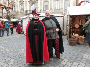 ←中世の仮装をした一般の街の住人さんor休憩中のお店の方?どちらでしょうか。写真を撮ってよいか尋ねたら、快くポーズをとってくださいました。ありがとうございましたm(__)m クリスマスマーケットの一画には舞台が設えられ、このときは、おじさんが管楽器を演奏中でした。