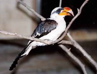 | 写真のマメ君は3羽いるセグロコサイチョウの中で唯一のオス。桜も咲いてポカポカとあたたかくなってくると、恋の季節を迎えます。オスはおいしそうなエサをくわえてメスにプロポーズ。メスは黒いクチバシだけど、オスはきれいな朱色。マメ君もクチバシにエサをくわえてウロウロ。でもちょっと待って。今アタックしているのは、朝アタックしていたメスじゃないよ!マメ君両方のメスにセッセとプロポーズ。ネッ、とってもマメでしょ! | ||||||||||||||