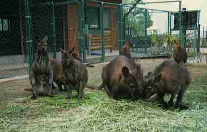 小さなカンガルーのワラビーは、体の色が茶色で、木陰にいるとどこにいるのか、わからなくなってしまうくらい地味なタイプ。まして、いつもいる場所はフェンスのそばの茶色い土の上。 「どこにいるの?ぜんぜん見えない。」なんて言っているあなた。よ〜く目を凝らしてもう一度さがしてみましょう。じつは、運が良ければ、足元にいることがあります。 ワラビーの放飼場には、お客さんと動物の間に深いモートがあって、動物たちがこちら側に来れないようになっています。 が、あるワラビーはフェンスのそばにはえている草を食べたいばかりに、運動能力を発揮。ピョーンピョーンとジャンプして、モグモグ。 そうなると悩む飼育係をよそ目に動物観察のビックチャンス! よ〜く見ると、パッチリ目に、なが〜いまつ毛、フワフワの毛にりっぱな後足を持っているんじゃない。 |
