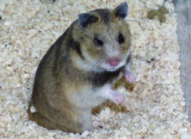 ![]() 野生のブラントハムスターは乾燥した岩の多いステップにすみ、時には農耕地の近くにも見られますが、森や林や草の茂った地域には住んでいません。明らかに湿度の高く湿った場所は嫌うようです。コーカサスでは標高2800mの場所でも見られます。夜明けや夕暮れに見られこともあるようですが、ほとんど夜行性です。日中は巣穴の中で休み、夜間に採食します。野生の状態でも、比較的、人を恐れないといわれています。 1965年8月に、トルコの首府のアンカラ市から125km東南のMalyaという場所で13頭が捕獲され、アメリカのハーバード大学に送られました。 気温が約5℃に低下すると、冬眠に入り翌年の春になって繁殖が始まりました。それまで動物の冬眠の研究には、リス類、コウモリ類、ヨーロッパハムスター、ハリネズミ類、コウモリ類などが利用されてきました。しかし、これらの動物は実験室内で簡単に繁殖せず、野生から捕獲したものが使われていたのです。ゴールデンハムスターは簡単に繁殖しますが、低温下で冬眠をさせると、多くの個体が死亡してしまいます。その点、ブラントハムスターは簡単に冬眠させることができるし、繁殖させることもできました。 1971年にアンカラ市近郊で29頭が捕獲され、これもアメリカに送られました。この個体群は、1965年の個体群と別に飼育され比較されました。すると染色体の数が異なることがわかりました。亜種の関係なのかもしれません。 ブラントハムスターはゴールデンハムスターに良く似ていますが、体がより大きくなります。成獣21個体の体重は、137−258gで平均163gでした。ゴールデンハムスターの成獣111個体の体重は、97−113gで平均105gでした。また、ブラントハムスターとゴールデンハムスターの間では、雑種ができないようです。 繁殖期はかぎられ11月から3月の間は繁殖しません。5月に繁殖のピークを迎えます。妊娠期間は約14日間で、5頭から14頭の子を生みます。寿命は短く、普通は約2年半で、長いもので4年とされています。 |